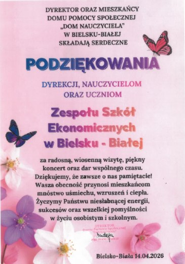 14 kwietnia 2026 r. uczniowie Ekonoma wraz z opiekunami odwiedzili DPS "Dom Nauczyciela" w Bielsku-Białej, gdzie zaprezentowali wiosenny koncert charytatywny dla jego mieszkańców. Był to wyjątkowy czas pełen wzruszeń, uśmiechu i życzliwości. Muzyka połączyła pokolenia i stworzyła niezwykle ciepłą, serdeczną atmosferę.