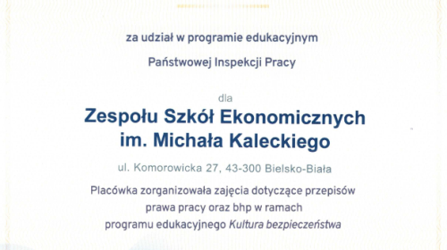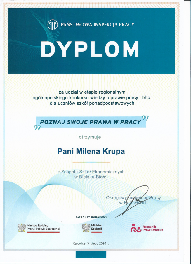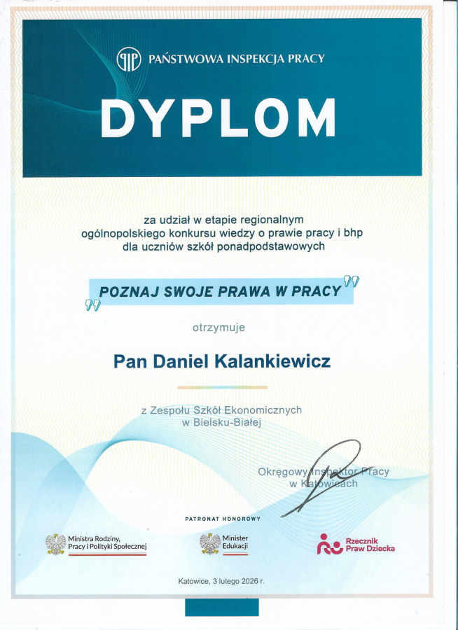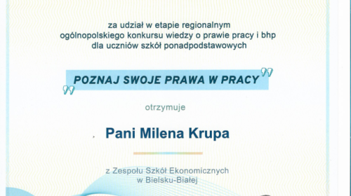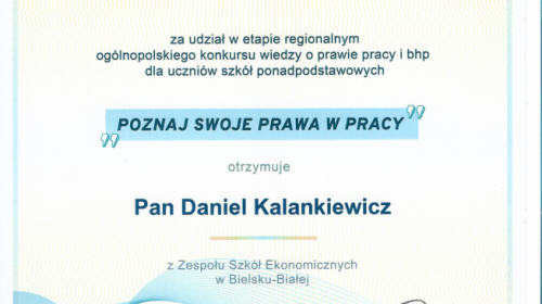 W etapie regionalnym naszą szkołę reprezentowali Milena Krupa z klasy 5le i Daniel Kalankiewicz z klasy 5ea, którzy kształcą się w zawodzie technik ekonomista. Uczniowie podczas rywalizacji rozwiązywali test z wiedzy obejmującej przepisy prawnej ochrony pracy dotyczące bhp, legalności zatrudnienia i innej pracy zarobkowej, ze szczególnym uwzględnieniem praw i obowiązków stron stosunku pracy.