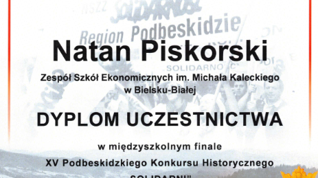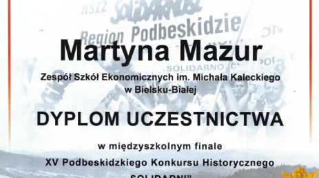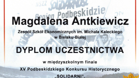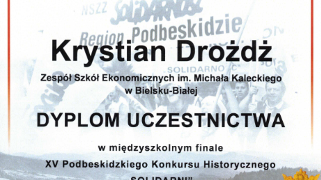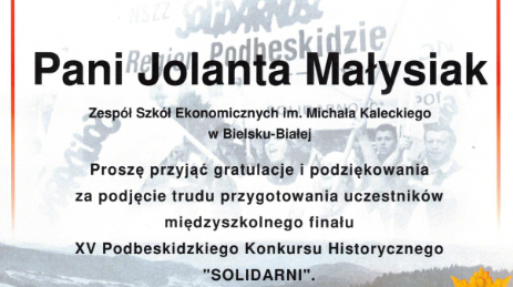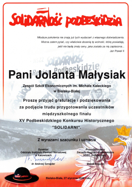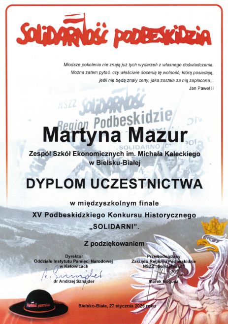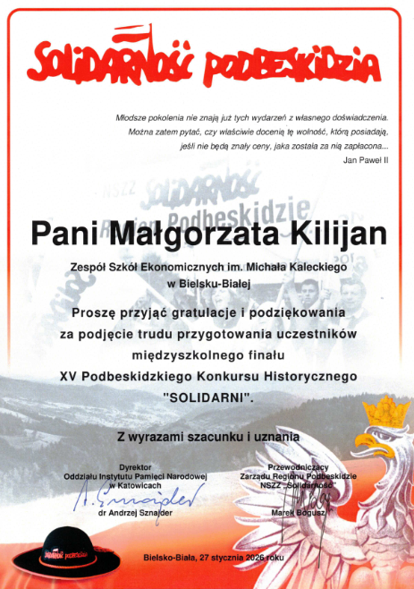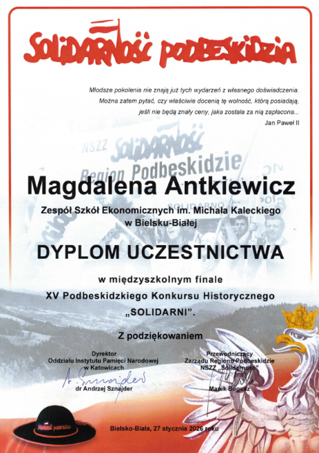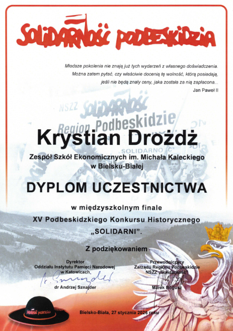 27 stycznia 2026 r. w Zespole Szkół Ogólnokształcących im. AK w Bielsku-Białej odbył się finał XV Podbeskidzkiego Konkursu Historycznego "Solidarni". W konkursowe szranki stanęło 51 uczniów z szesnastu szkół ponadpodstawowych z Cieszyna, Czechowic-Dziedzic, Żywca i Bielska-Białej. Naszą szkołę reprezentowali zwycięzcy etapu szkolnego: Magdalena Antkiewicz z kl. 3r, Krystian Drożdż z kl. 3l oraz Martyna Mazur i Natan Piskorski z kl. 4r. Etap szkolny odbył się 12 grudnia 2025 r. - w przeddzień 44. rocznicy wprowadzenia stanu wojennego.