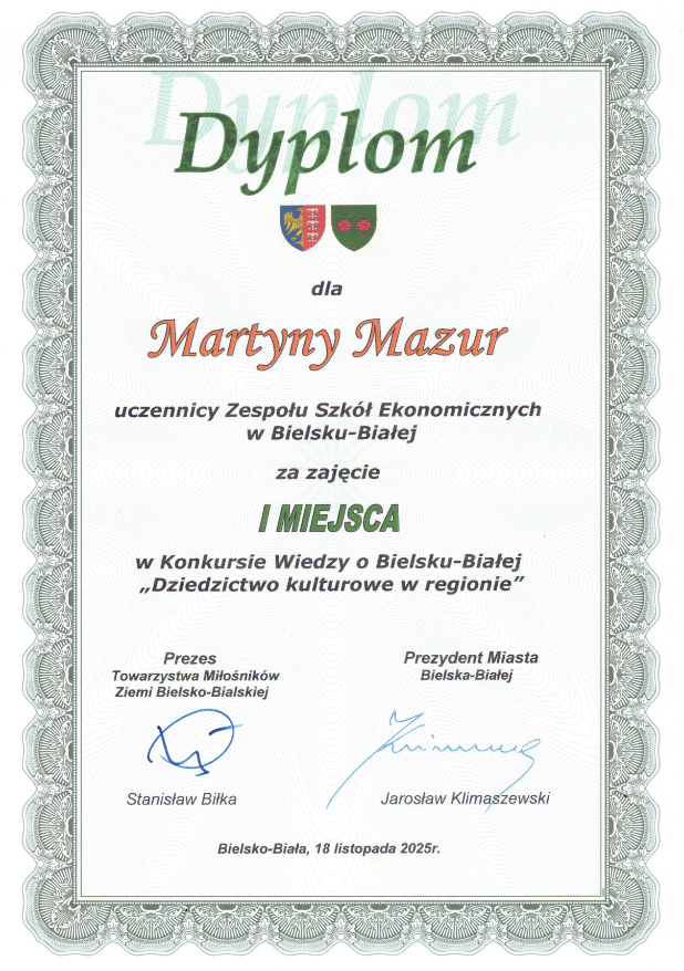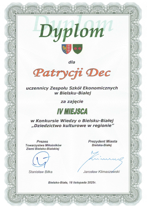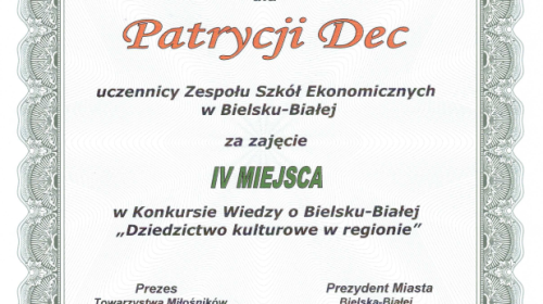 Patrycja Dec i Martyna Mazur oraz uczennice z klasy 5hr Kinga Markiel i Katarzyna Micek, wygrały etap szkolny Konkursu, w który uczestniczyło 11 osób. Następnie 16 października reprezentowały naszą szkołę na etapie międzyszkolnym w Bielskiej Szkole Przemysłowej. Dwa tygodnie później Martyna i Patrycja uczestniczyły w finale ustnym Konkursu.
