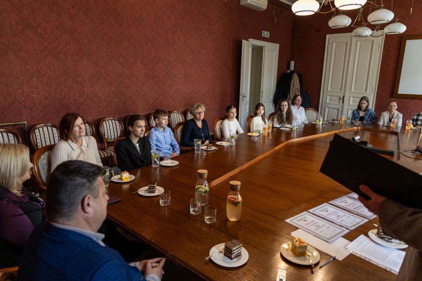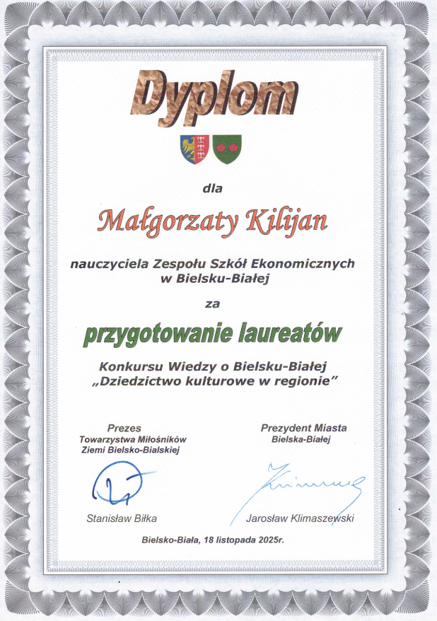 Tradycyjnie, co roku w listopadzie w bielskim Ratuszu odbywa się uroczystość wręczenia nagród laureatom Konkursu Wiedzy o Bielsku-Białej. Wczoraj,18 listopada 2025 r. tegoroczni laureaci 39. edycji Konkursu odbierali dyplomy i nagrody z rąk zastępcy Prezydenta Miasta Pana Piotra Kuci oraz Naczelnika Wydziału Edukacji i Sportu Pani Agnieszki Hermy. W uroczystości uczestniczyli też przedstawiciele najstarszej organizacji pozarządowej działającej w naszym Mieście - Towarzystwa Miłośników Ziemi Bielsko-Bialskiej: Pan prezes Stanisław Biłka i dr Rafał Butor - organizator Konkursu z ramienia TMZBB oraz nauczyciele przygotowujący finalistów.